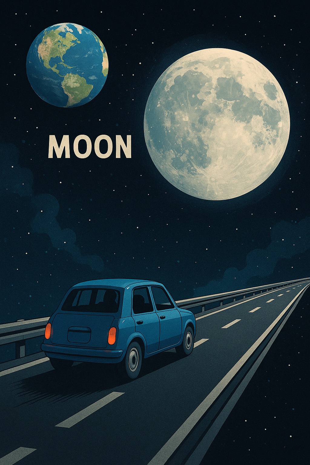 지구에서 달까지 직선 고속도로가 뻗어 있고, 그 위에서 자동차가 무중력 상태에서도
