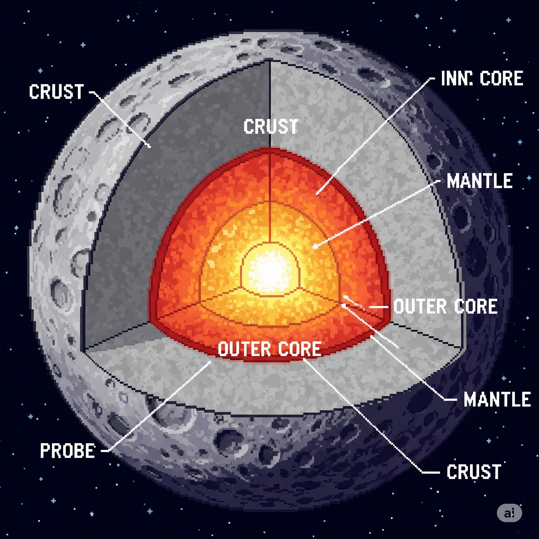| 🪨 내핵 (Inner Core) | 반경 약 240 km | 고체 철, 높은 밀도. 달 전체 반지름(1,737 km) 대비 매우 작은 비중 |