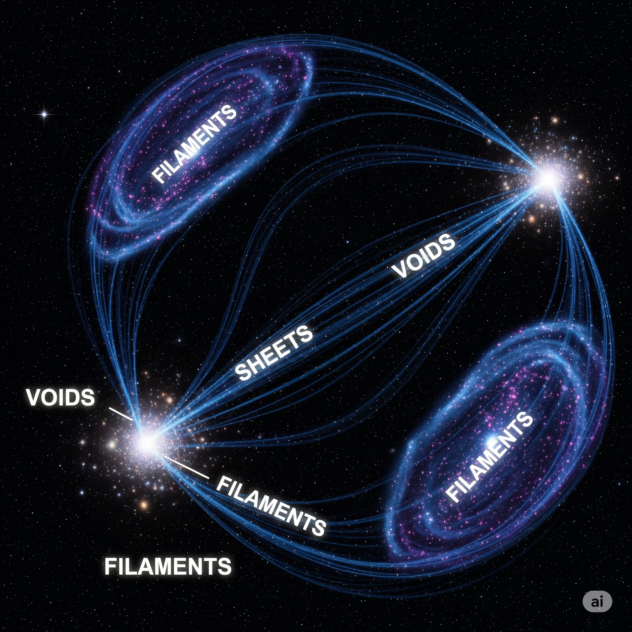 - 현재의 Cosmic Web 완성 – 수십억 년에 걸쳐 필라멘트와 보이드가 더욱 뚜렷해지며 오늘날의 거대 구조가 됨.