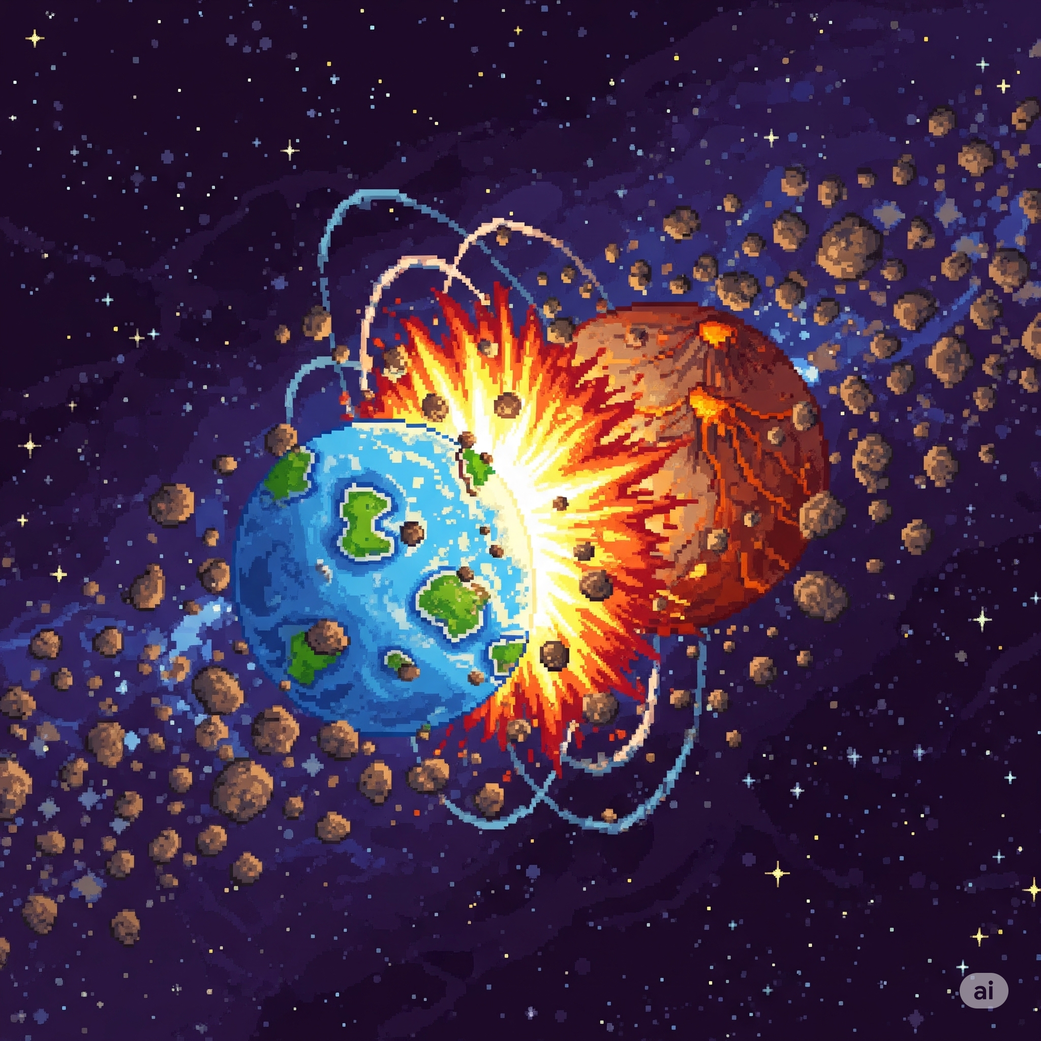 공룡을 포함한 생명체의 75% 이상을 멸종시킨 사건으로 기록됩니다. - 달의 기원 – 거대 충돌 가설: 초기 지구가 화성 크기의 ‘테이아(Theia)’와 충돌해 파편이 달을 형성했다는 이론은