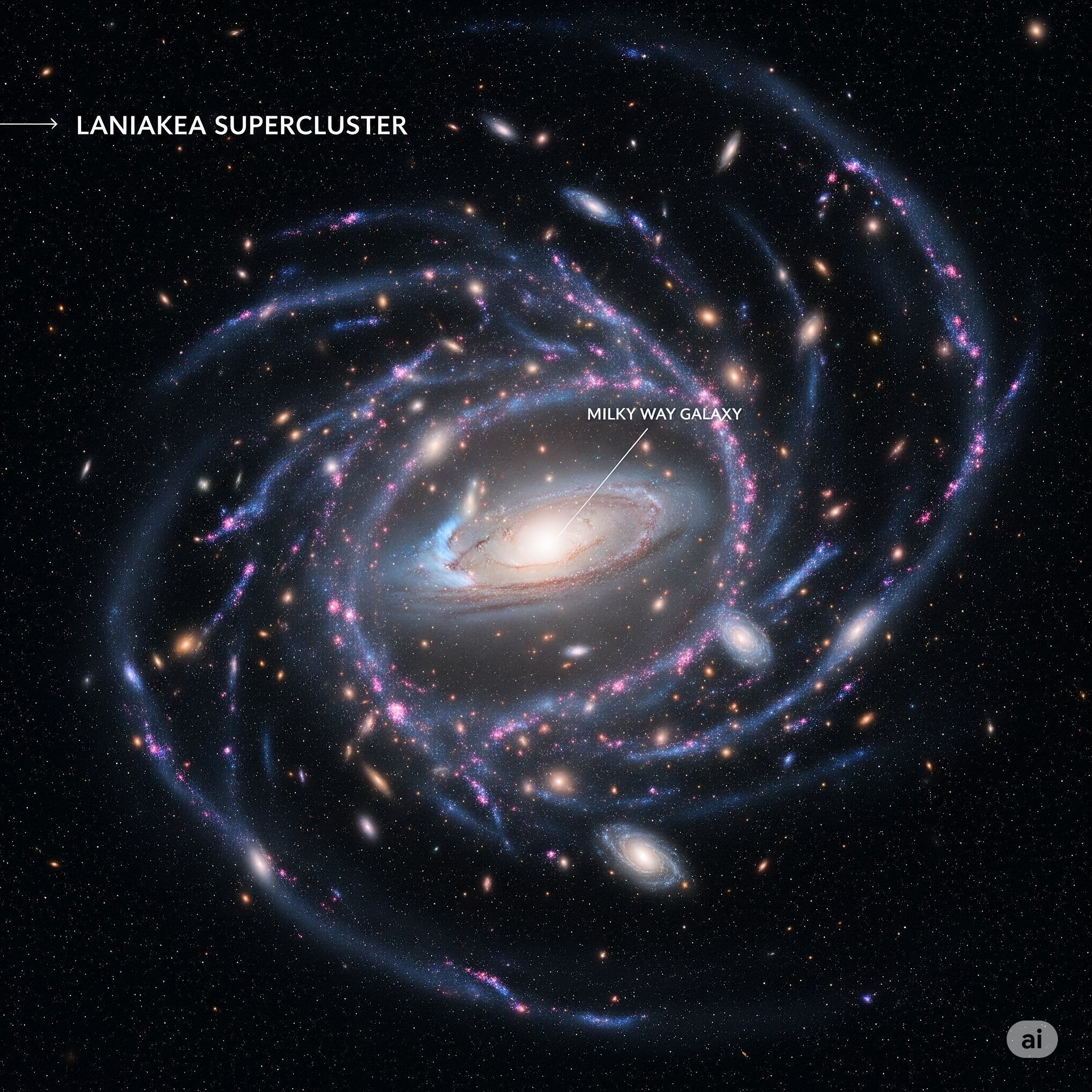 우리는 **라니아케아 초은하단(Laniakea Supercluster)**의 한 모서리에 살고 있습니다.